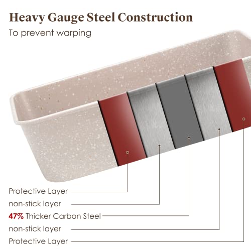 Durable Bread Pan & Baking Tray: The heavyweight construction and 1.1mm thick rolled edges of each baking pan help to prevent warping and will last through many years of baking. And compared to other cookware of the same thickness, our cookware is 28% heavier, which means our cookware can better balance the thickness, weight and even heat transfer, so your cookies & cakes come out of the oven evenly baked
