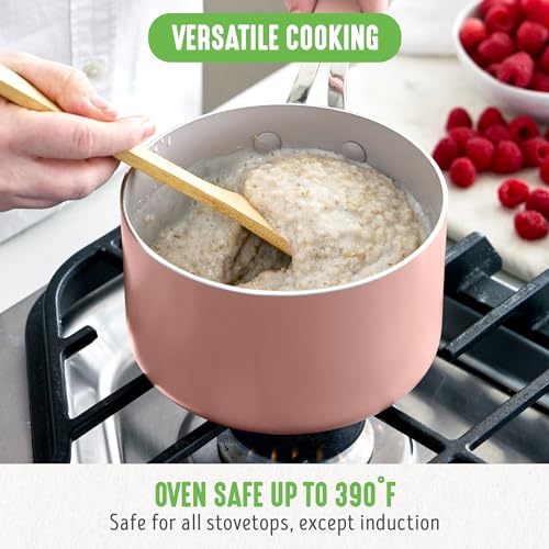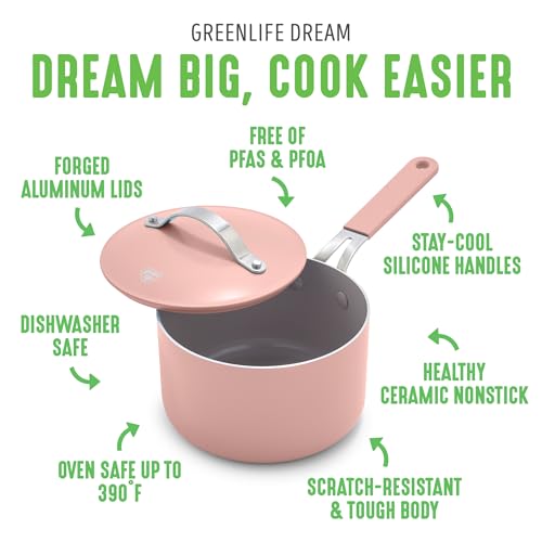 GreenLife 2-Quart Ceramic Nonstick Saucepan with Lid,Dishwasher & Oven Safe, Silicone Stay-Cool Handles, PFAS-Free Ceramic Coated Pots with Lids, Healthy Kitchen Cooking Set, Dream Dusty Pink