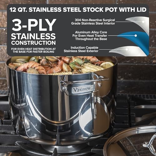 Viking 3-Ply Stainless Steel Stock Pot, 12 Quart Soup Cooking Pot with Lid, Kitchen Cookware, Dishwasher and Oven Safe, Induction Ready, Silver