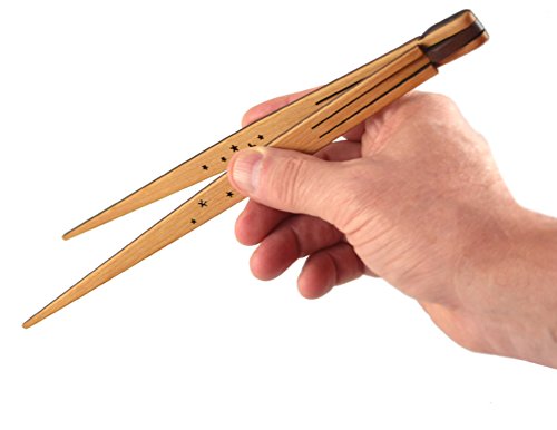 A beautiful balance of fine craftsmanship and graphic arts, these unique chopsticks are crafted from wild cherry wood enhanced with laser-cut moon and stars. With a flame-blackened edge, the warm color of the natural cherry wood provides a handsome contrast. The hinged chopsticks are strong, exceptionally easy to use, and – best of all – fold flat for easy storage or travel. The chopsticks are all-natural, food safe, solid cherry hardwood with a natural color that will deepen with age. Handcrafted in the USA.