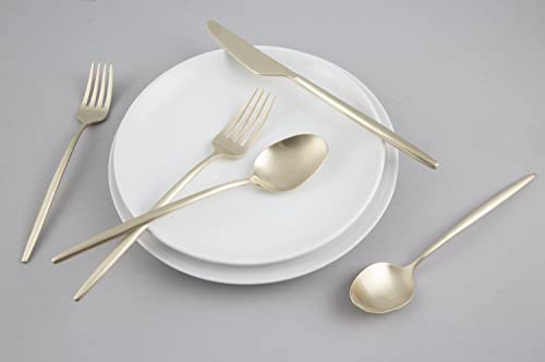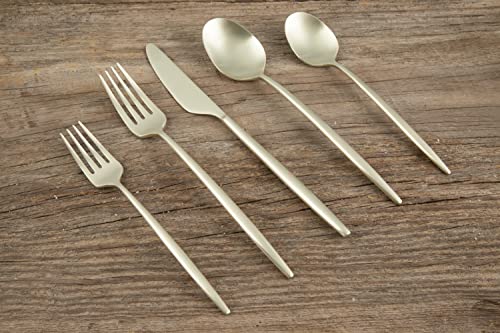 20-piece forged service for 4 with a slender handle that evokes a classic Scandinavian feel in a modern brushed, champagne gold finish.