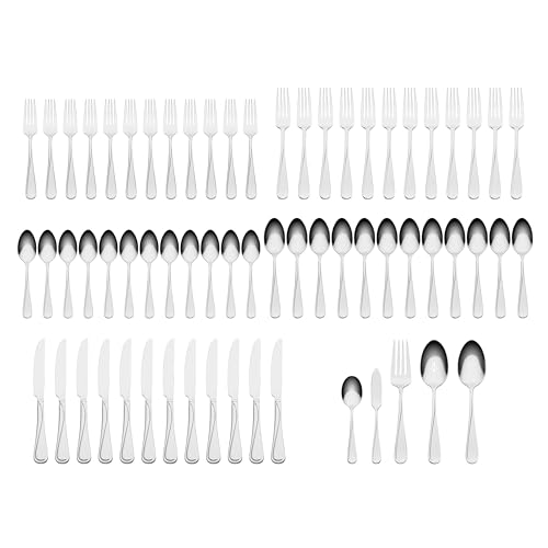 WHAT’S IN THE BOX: Includes a 65-piece flatware set for 12 people, plus a 5-piece serving set. Each of the 12 flatware place settings includes a dinner fork, salad fork, dinner knife, dinner spoon, and teaspoon. Serving set includes a serving spoon, pierced serving spoon, sugar spoon, butter knife, and serving fork.