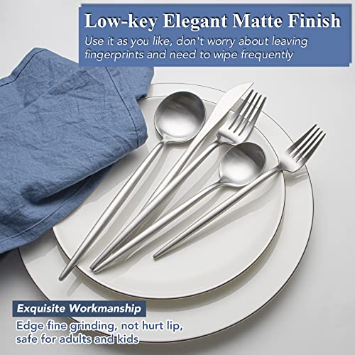 【Unique Silverware Set with Silver Satin Matte Finish】Unique design, elegant silver matte look, different from the conspicuous mirror finish or black tableware, our matte dinnerware exudes an understated aura of elegance, and will not easily leave fingerprints on them. Unique but modern flatware set for 8 blends with many dinnerware, Elevate the dining experience with decent silverware sets