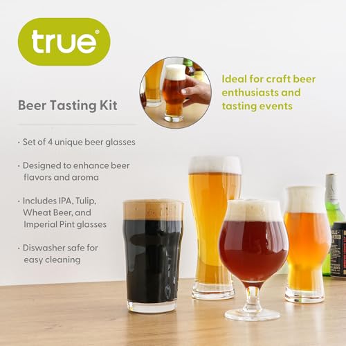True Craft Beer Tasting Kit Glasses, Dishwasher Safe for Drinking IPAs, Tulips, Hefeweizen, and Imperial Pint Glassware, Set of 4