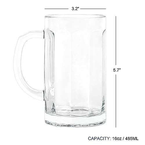4 Pack Heavy-Duty Glass Mugs – 16oz Beer Glasses, Large with Handle, Freezer Safe, Classic Beer Mug Set for Bar & Beverages