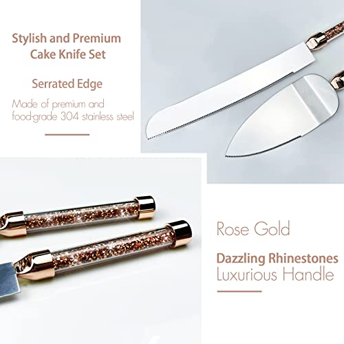 Wedding Cake Knife and Server Set: The wedding cake knife and server set are made of premium golden 304 stainless steel. Golden diamond-like rhinestones are filled inside the handle which create a sense of luxury and elegance, and make this cake cutting set for wedding unique