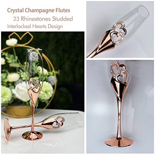 Handmade Craftsmanship: Our crystal champagne flutes and cake cutting set for wedding are masterfully shaped and hand-blown by artisans using traditional methods. The result is a unique work of art. The rose gold interlocked hearts metal base is plated with 2 extra layers rose gold compared to the silver metal base. Hence, the Rose Gold color looks more luxurious