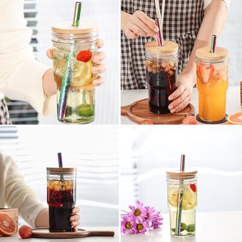 PREMIUM MATERIAL: Our 24 ounce mason glass cups are made of high-quality glass which ensures long-lasting use, food-grade 304 stainless steel straws, and natural bamboo lids, BPA-free and Lead-free. The wide-mouth design adds convenience to your daily activities, making it a reliable choice for various purposes