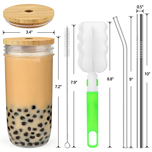 4 Pack Glass Cups Set – 24oz Mason Jar with Bamboo Lids and Glass Straw & 12 Airtight Lids, Brush – Glass Drinking Cups, Reusable Travel Tumbler Bottle for Iced Coffee, Smoothie, Bubble Tea, Gift