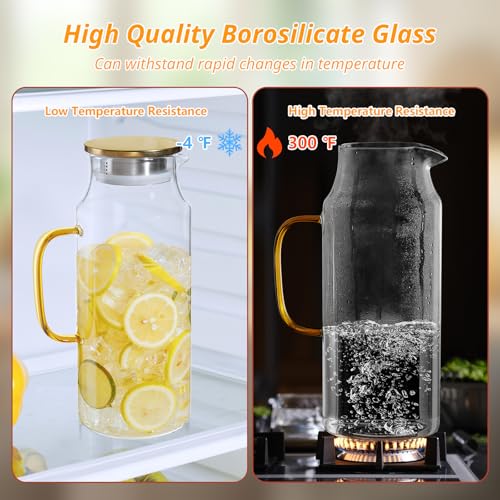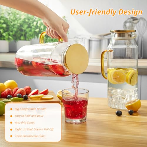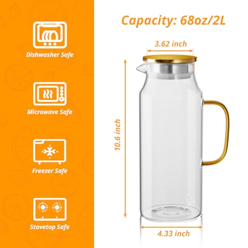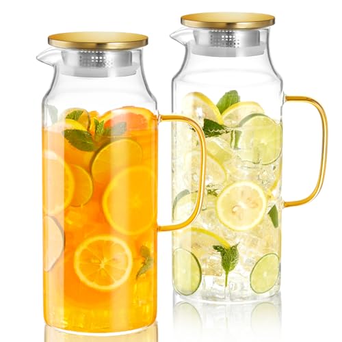 2 Pack 2 Liter 68 oz Glass Pitcher with Lid and Spout, Gold Glass Water Pitcher for Fridge, Glass Carafe for Hot/Cold Water, Large Jug for Iced Tea, Coffee, Juice and Homemade Beverage