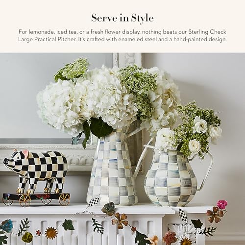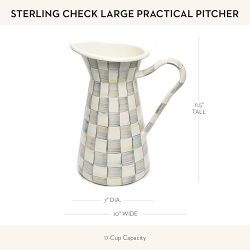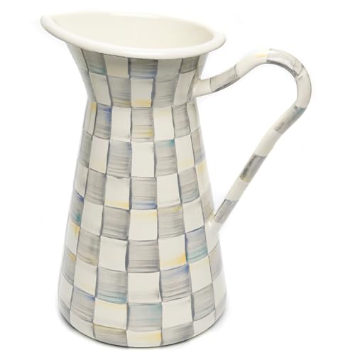 MACKENZIE-CHILDS Practical Enamel Pitcher with Spout, Drink Pitcher for Iced Tea or Water, Flower Vase, Large, Gray-and-White Sterling Check
