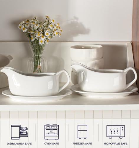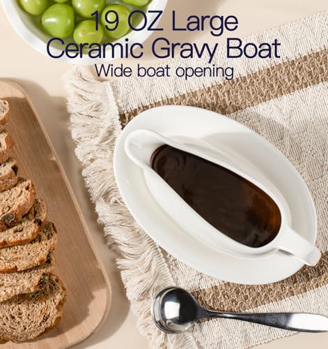 Gravy Boat with Saucer 19 oz,Ceramic Gravy Boats with Tray Set of 2, Gravy Bowl for Turkey,Dispenser with Tray for Sauces,Beef, Salad Dressing, Creamer, Broth,Microwave and Dishwasher Safe Gravy Boats