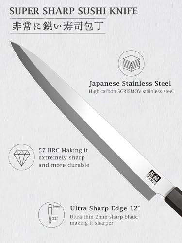 JAPANESE STAINLESS STEEl SUSHI KNIFE: The blade is made of high-quality japanese stainless steel with a hardness of 57 HRC, which provides highly anti-rust quality. It’s easy for resharpening, cleaning and maintaining