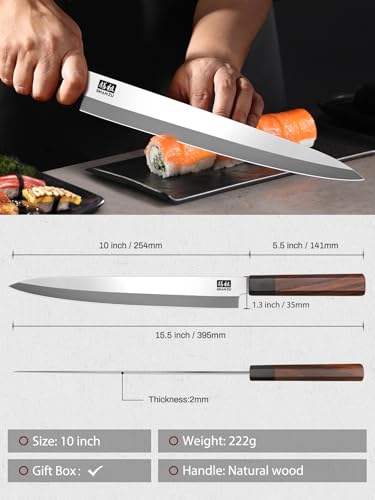 10 INCH SASHIMI SUSHI KNIFE: Our knives come in beautiful gift boxes. It is a perfect gift choice. Beautiful storage box can also ensure it remains clean and secure whenever you need it