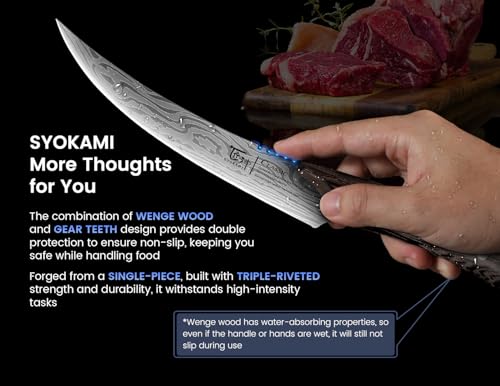 Fourfold security protection: The combination of WENGE WOOD and GEAR TEETH design provides double protection to ensure non-slip, keeping you safe while handling food. Forged from a SINGLE-PIECE, built with TRIPLE-RIVETED strength and durability, it withstands high-intensity tasks