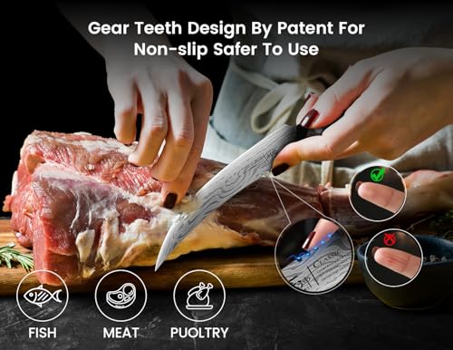 For non-slip consideration, we have added a contemporary gear teeth element to this boning knife. Combined with the overall classic shape, it is both beautiful and practical – ensuring a stable grip even when wet and ensuring your safety while dealing with your food