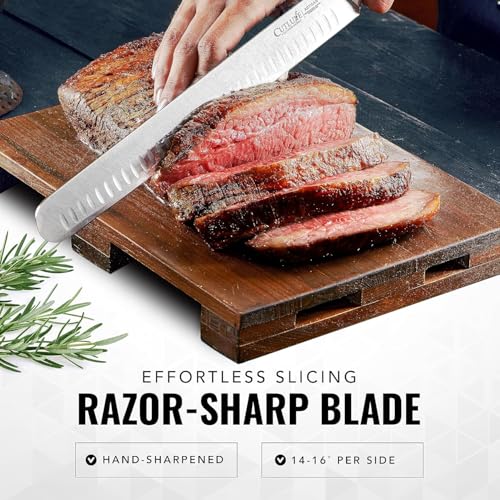 RAZOR-SHARP GRANTON BLADE EDGE: Experience premium performance with razor-sharp granton blades on both knives, reducing friction and preventing meat from sticking, making slicing effortless.