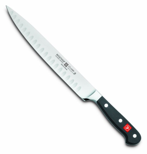 “Wusthof Classic 9″” Granton Hollow Edge Carving KnifeThis Wusthof Classic 9″” forged granton edge craving knife is perfect for carving larger cuts of meat, as well as for fruits and vegetables. The hollow granton edge creates pockets of air which prevent extra thin or soft slices from sticking to the blade. The granton edge carving knife is forged from one piece of specially tempered high carbon steel with a stain-resistant alloy. It’s buffed by hand and seamlessly attached to a highly durable polymer handle. For precision handling, the handle features a full tang, triple-riveted design and is contoured with a comfortable grip.Standard Features:Classic 9″” Granton Hollow Edge Carving Knife Length: 9″” Perfect for Slicing Large Meats, Fruits and Vegetables Hollow Edge Created Pockets of Air Forged From One Piece of Specially Tempered High Carbon Steel with Stain Resistant Alloy Durable Polymer Handle and Full Tang Triple-Riveted Design Contoured with a Comfortable Grip Dishwasher Safe, But Hand-Washing Recommended Lifetime Guarantee Made in Germany Model#: 4524-7/23 240662 Tough polypropylene handles with full, visible tangs and the traditional three rivets distinguish Classic knives from Wüsthof’s other cutlery lines. Otherwise Classic knives are identical to other Wüsthof knives, embodying all the virtues that have earned the German manufacturer world renown. The principal parts of a Wüsthof knife–blade, bolster, and tang–are forged from a single piece of high- carbon stainless steel, and the blade is precisely tapered from bolster to tip and from back to hand-honed edge. Blades and beautifully formed bolsters are not as thick as some knives’. As a result, despite their heft, strength, and durability, Wüsthof knives are pleasingly delicate and marvelously balanced in action. With its long, narrow blade, this 9-inch carving knife neatly slices a roast, ham, or turkey into serving portions. Alternating hollows on each side of the blade create air pockets, allowing slices to fall away cleanly and permitting thinner slicing. Like all fine knives, it should be hand washed.”