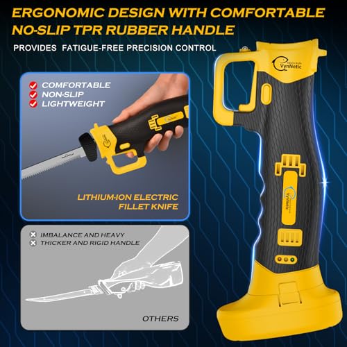 More Efficient & Durable Motors: This electric knife equipped with a potent high-speed, high-torque motor that reduce heat generation. VynNetic electric fillet knife features a lightweight, ergonomic design, Non-Slip Grip handle crafted from a rubber-coated. Cordless and lightweight design brings you an enhanced maneuverability, allows you to move unboundedly in the kitchen without being restricted by a power cord. Without applying too much pressure to achieve fast, smooth and easy slicing, reducing cutting fatigue, allowing you to enjoy the fun of cutting fish fillets and save your precious time!