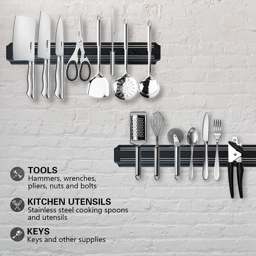Multifunctional magnetic knife strip: The magnetic knife holder allows you to make full use of its wall space, so that your tools and knives do not need to occupy tight drawer space. It is not only used in kitchens, like gardening tools, garages, outdoor barbecue tool baskets, but it can play a role as long as it is a metal tool. Without any friction, the cutting tool can be better protected.