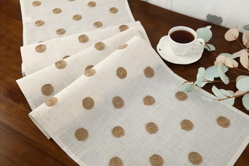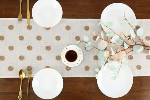 Praline Linen Table Runner Beige Table Runner with Jute Embroidery Rustic Table Runner for Modern Fall Farmhouse Table Decor Linen Runners for Tables Washable Poly Linen Fabric (15×72, Polka Dot)