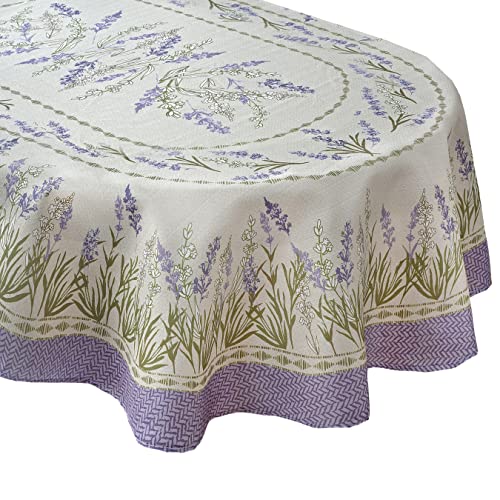 STYLING: The Provence Blanchard Field of Lilacs Bordered Print Country French Fabric Tablecloth by Home Bargains Plus is indoor and outdoor, stain resistant, water resistant, and wrinkle free. This beautiful lilac field pattern features soft lavender blooms of lilacs with green leaves on fully engineered borders of lilac on a beige background.
