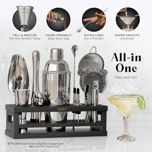 BARE BARREL® Mixology Bartender Kit Bar Set | 16-Piece Cocktail Shaker Set | Martini Barware Mixing Tools for Home Bartending | Incl. 35 Recipe Cards | Gift Set (24oz Cobbler Shaker, Silver/Black)