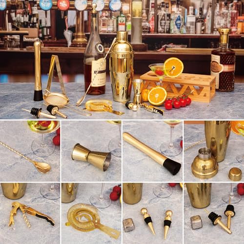 Cocktail Shaker Set Bartender Kit with Bamboo Stand,13 Piece Bar Set Stainless Steel Bar Tools Set for Professional Bartender and Home (Gold)