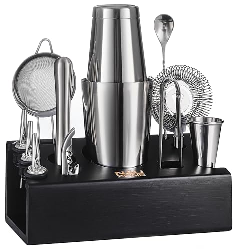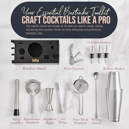 Nauzone Mixology Bartender Kit – 12-Pieces Cocktail Shaker Set with Stylish Bamboo Stand – Bar Accessories with All Essential Accessory Tools – Bar Set Perfect Drink Mixing Experience