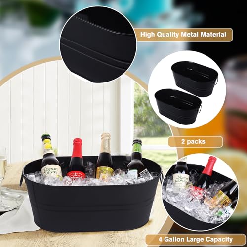 Galvanized Tub Beverage Tubs, 2pcs Metal Ice Buckets for Cocktail Bar 3 Gallon Wine Beer Drink Buckets with Handles Large Tub Cooler Mimosa Bar Supplies Ice Bucket for Parties (Black)
