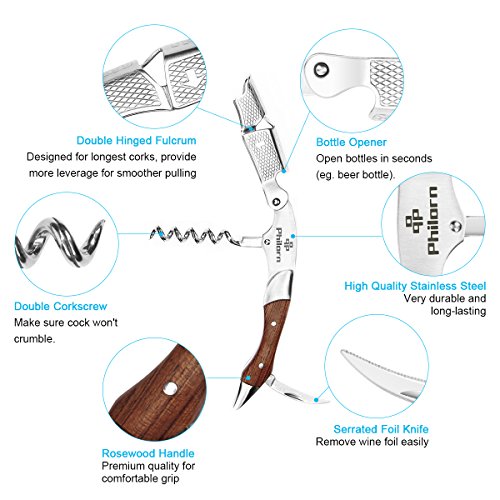 Philorn Wine Opener-Professional Corkscrew Wine Opener with Foil Cutter & Cap Remover, Manual Wine Key for Servers, Bartenders, Waiters & Home Use, Rosewood Handle Wine Bottle Opener