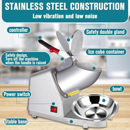 Easy to operate: The Ice Crusher Ice Shaver features a waterproof on/off switch for easy control, and automatically cuts off the power when the hopper handle is lifted, providing additional safety. Electric Ice Crushers are effortless to operate – just plug in, add ice cubes, and press the non-slip handle to start shaving ice. Snow Cone Maker Machine includes a food grade stainless steel bowl for added convenience