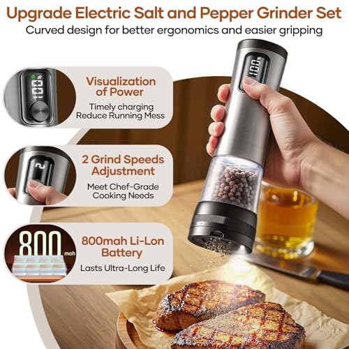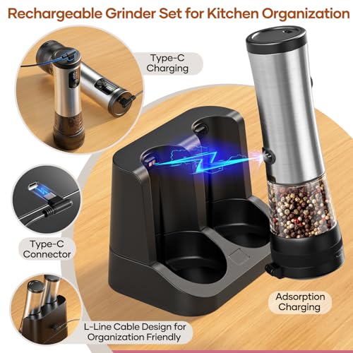 Electric Salt and Pepper Grinder Set – Ceramic Grinder Automatic Pepper Mills with Battery Display Rechargeable Base, Stainless Steel Salt Shakers with 5 Level Adjustable Coarseness for Modern Kitchen