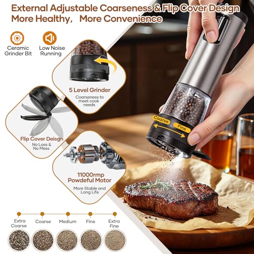Adjustable Coarseness – Electric salt and pepper mills set, external coarseness adjustment button, 5 grinding settings, easy to adjust the coarseness of the particles, to meet different cooking needs from fine powder to coarse particles. One-piece lid design, more hygienic and healthier.
