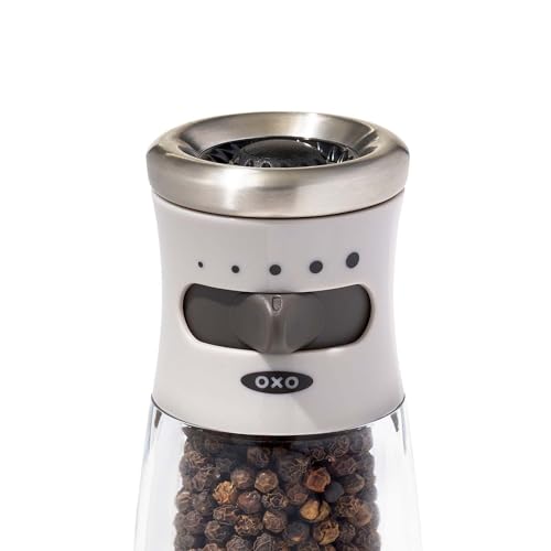 The sleek and stylish OXO Good Grips Pepper Grinder is an ideal addition to any kitchen or dining table. This manual Grinder has stainless steel accents and a clear acrylic body, so you’ll know when it’s time to refill. Rotate the tab to choose one of five levels of grind, from fine to coarse. An airtight lid keeps peppercorns fresh and dry while the non-slip grip allows for easy, comfortable use. Grind and serve from the top for mess-free storage. Comes pre-filled with black peppercorns. Hand-wash only.