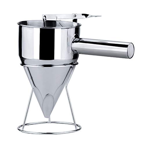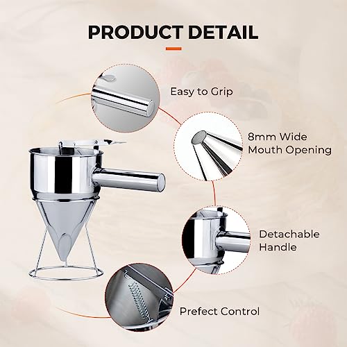 đ°ăDetachable Handle, Space SavingăThis metal funnel is featured with a detachable handle, you can remove the handle as your need which is convenient for storage & space saving. Coming with a stand rack that will hold the dispenser keeping your kitchen neat & clean. Great cooking tool accessory for home, restaurant, hotel, snack bar, cake shop, bakery, cafe.