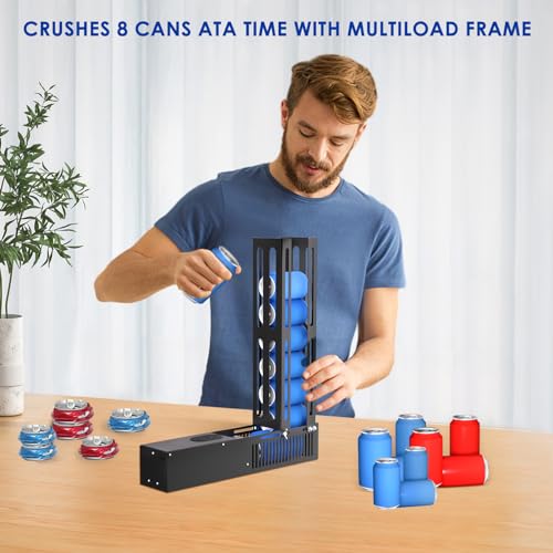 HIGH CAPACITY – 8 Cans. The can crusher can crush 8 cans in 5 seconds. The electric can crusher saves space in your trash or recycling bin by crushing cans down to 20% of their original size. Perfect gift for your friends and family to save remarkable storage space at their homes and garages