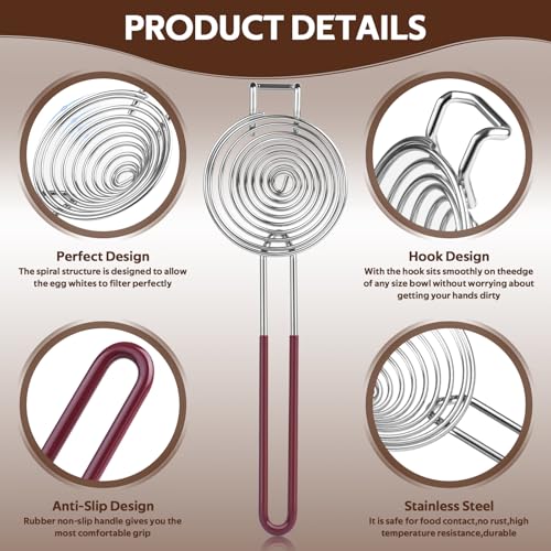 Unique Design:The spiral structure of this egg separator ensures perfect filtration of egg whites without damaging the yolk.The egg yolk separator features a hook that fits any size bowl,preventing messy hands and keeping eggshell pieces out of your mixture.