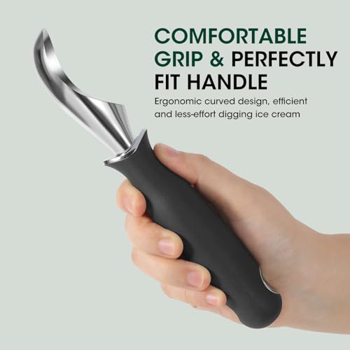 Effort-Saving Extended Handle: Designed with a lengthened handle and an ergonomic concave arc for enhanced finger stability, this ice cream scoop ensures a stable grip while reducing wrist strain. The soft rubber-wrapped handle provides a comfortable, anti-slip hold for effortless use