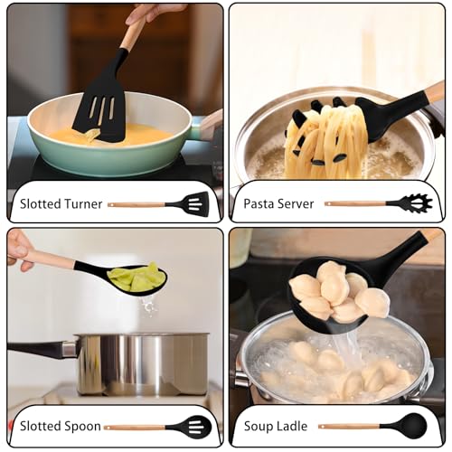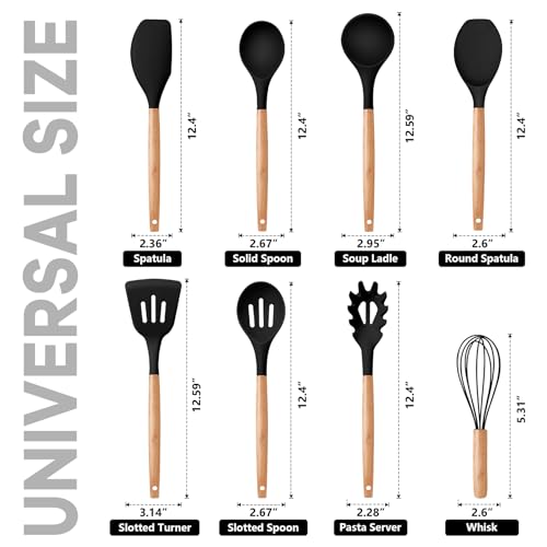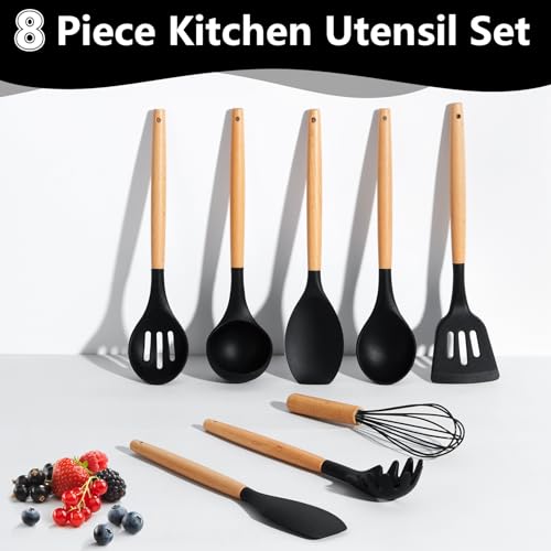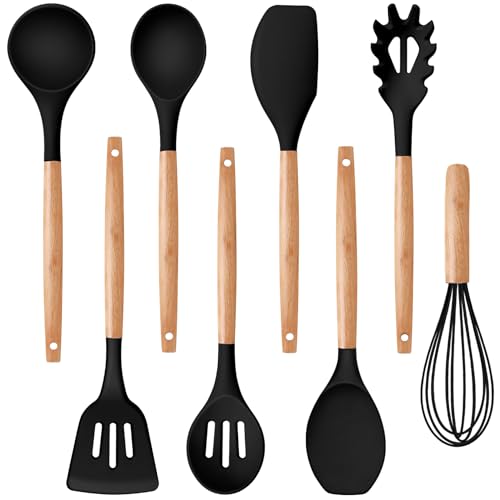 P&P CHEF Silicone Cooking Utensils Set, 8-Piece Kitchen Cooking Utensil with Wooden Handle, Silicone Spatula for Nonstick Cookware, Heat-proof & Easy Clean, Black
