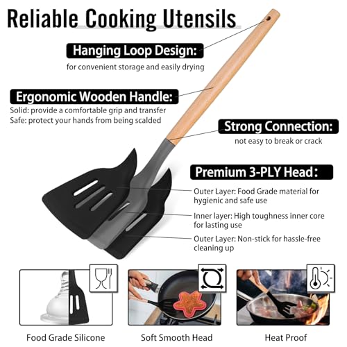 【Healthy & Premium Material】P&P CHEF silicone cooking utensils set is crafted from food-grade silicone and premium wooden, Both materials will not react with food or beverages, No need to worry about chemicals leaching into your food, Silicone heads are made of 3 layers, Two outer layers are made from healthy material for safe use, The inner layer features with high toughness to provide long-tern time use, Great alternative to plastic or wooden utensils