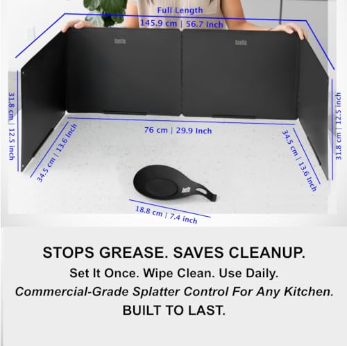 【Large Size for Better Coverage – Check Fit Before Buying】This extra-large 4-sided splatter guard provides expanded coverage for most standard stovetops. The back panel measures 29.5″ wide, with side panels 13.6″ deep and 12.5″ tall. Please measure your cooktop and backsplash height before purchase to ensure the right fit.