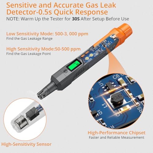 【Adjustable Sensitivity】This natrual gas leak detester supports High Sensitivity Mode: 50-500ppm, Low Sensitivity Mode: 500-3000ppm. Increase sensitivity dial to find small gas leaks. Decrease sensitivity to find larger explosive gas leaks while filtering out false alarms from background gas levels, which is much more convenient to use.