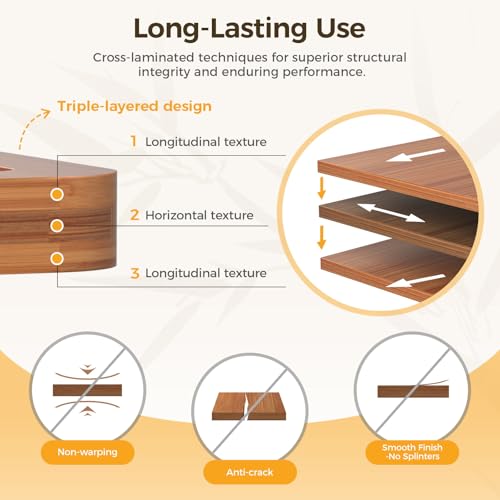 【Extra Durable and Eco-Friendly Construction】 These cutting boards are charred at 500°F (260°C) to absorb only 5% moisture. Made from sustainably sourced organic bamboo, which grows 30 times faster than hardwood, they are both environmentally friendly and durable. Cross-laminated for added toughness, these kitchen bamboo cutting boards resist warping and cracking with everyday use, enhancing their stability.