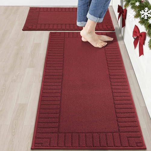 BEQHAUSE-Kitchen-Rugs-and-Mats [2PCS] Non Slip Kitchen Mats for Floor,Machine Washable Burgundy Red Kitchen Rugs,Polypropylene Kitchen Floor Mat with TPR Backing 20x30inch/20x48inch