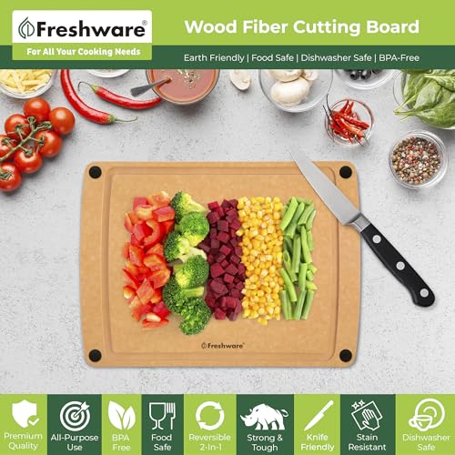 Easy To Clean and Dishwasher Safe: Set of 2, Medium 12″ x 9″ and Large, 15″ x 11.25″ wood fiber cutting board, wooden natural color, juice groove, non-slip silicone feet, dual-sided cutting surface. If you are looking for a crafted wood cutting board that is extremely safe to use, then we got you covered. BPA-free, dishwasher safe, Freshware wood cutting boards provide a clean food prep surface for every meal.