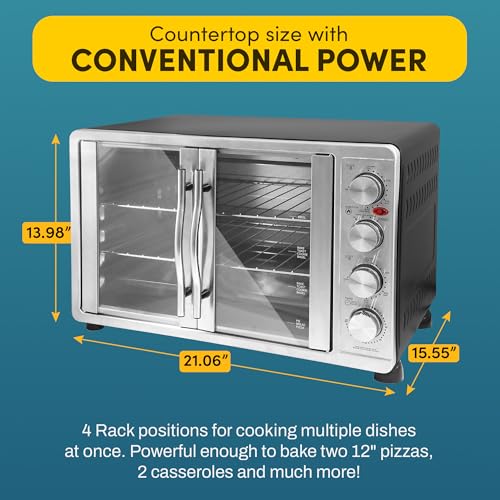 Elite Gourmet ETO-4510M French Door 47.5Qt, 18-Slice Convection Oven 4-Control Knobs, Bake Broil Toast Rotisserie Keep Warm, Includes 2 x 14″ Pizza Racks, Stainless Steel