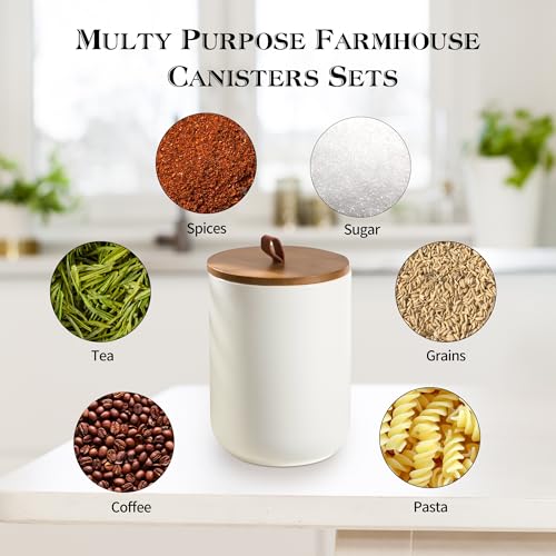 Canister Sets for Kitchen, Ceramic Kitchen Canisters with Airtight Wood Lids, Kitchen Canisters for Countertop for Coffee, Tea, Spice, Sugar, Grains, Salt (White)