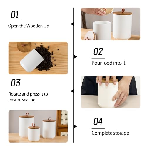 White Canister Sets for Kitchen, 3pcs Ceramic Canisters with Airtight Wooden Lid, Food Storage Jar, Large Kitchen Storage Containers for Serving Coffee Beans, Tea, Sugar, Salt, Spices