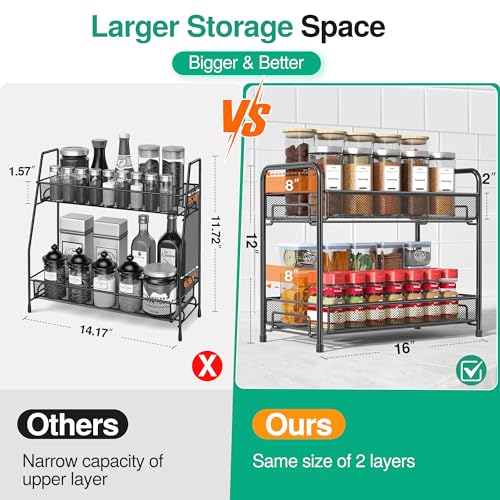 【2 Tier Large Capacity】16(L) x 8(W) x 12(H) inches, 2 tier capacity is excellent for the kitchen and saves space,which can accommodate more spice bottles or other things. Pay less to get more storage space in any room of the house!